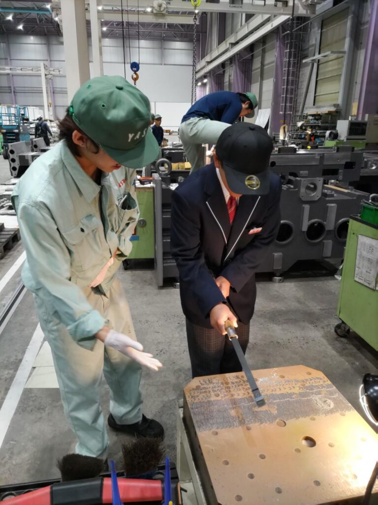 初日の工場見学ではマシニングセンタを見たり、サンプルを触って驚いたり、実際にキサゲ体験をして仕事の難しさを感じたりしていました。